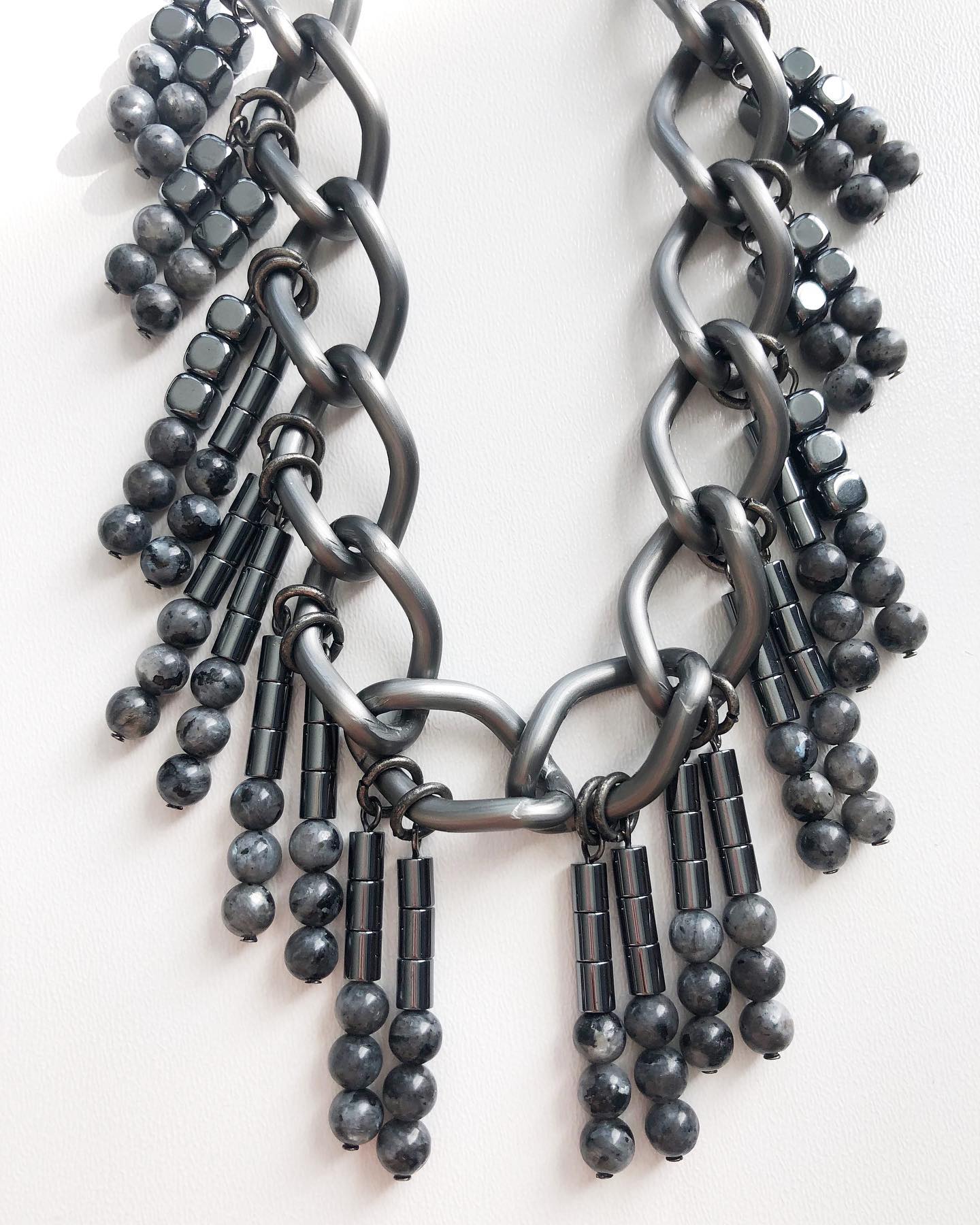 Połączenia ciężkich łańcuchów, naturalnych kamieni, surowych pereł — to coś, co ją wyróżnia. Biżuterię, która nie udaje, lecz pokazuje swoją autentyczność.